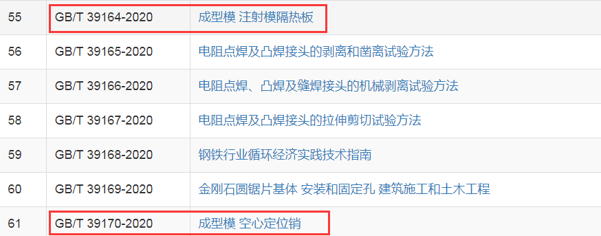 GB/T39164-2020《成型模注射模隔热板》和GB/T39170-2020《成型模空心定位销》是新制定国家标准,使用重新起草法修改采用ISO15600:2000和ISO9449:2007,对ISO标准内容进行了必要的技术性和编辑性修改。